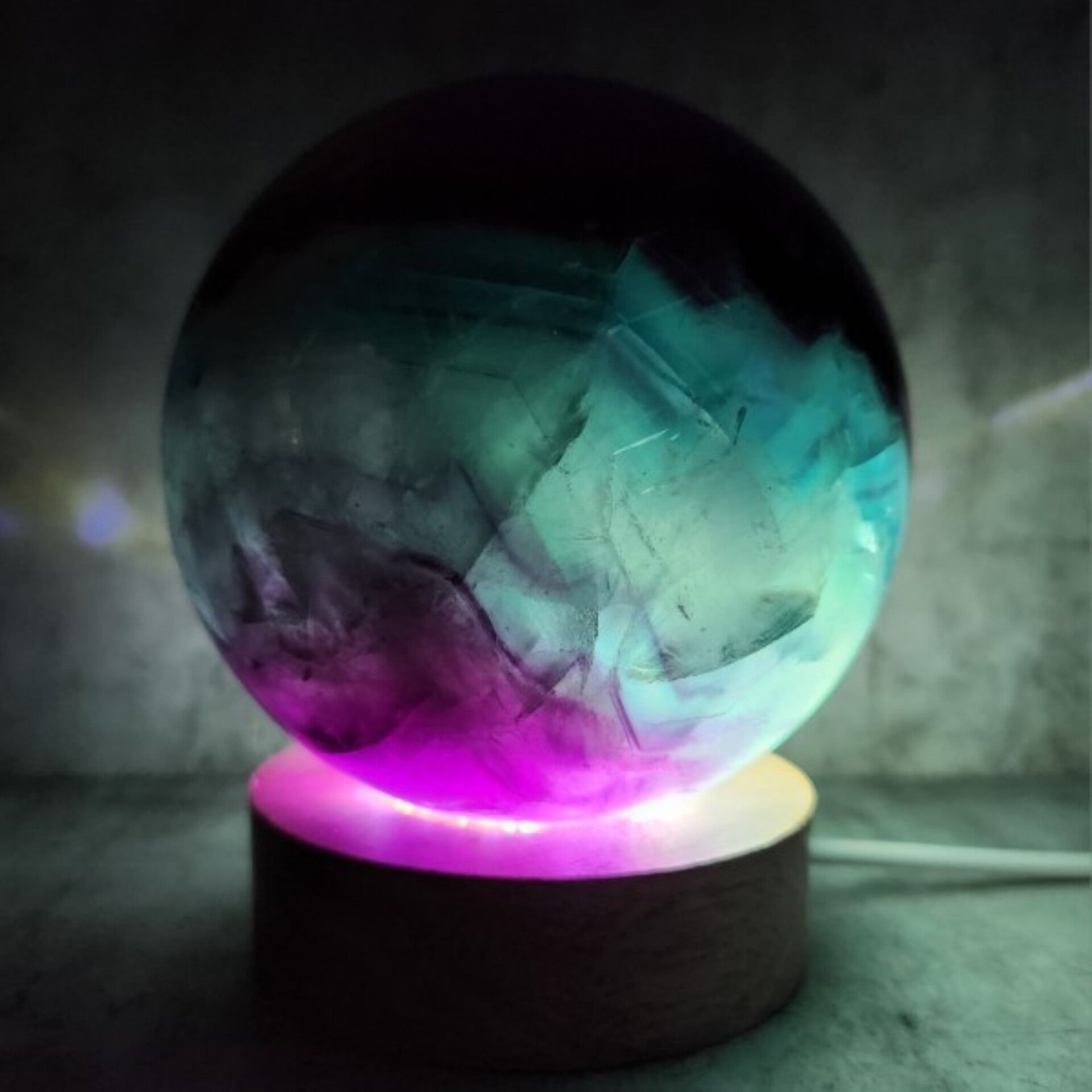 Regenboog Fluoriet bol met levendige paarse en groene schakeringen. Ondersteunt mentale helderheid en intuïtieve inzichten. Deze bol bevordert balans tussen denken en voelen – een visueel en energetisch anker in je ruimte.