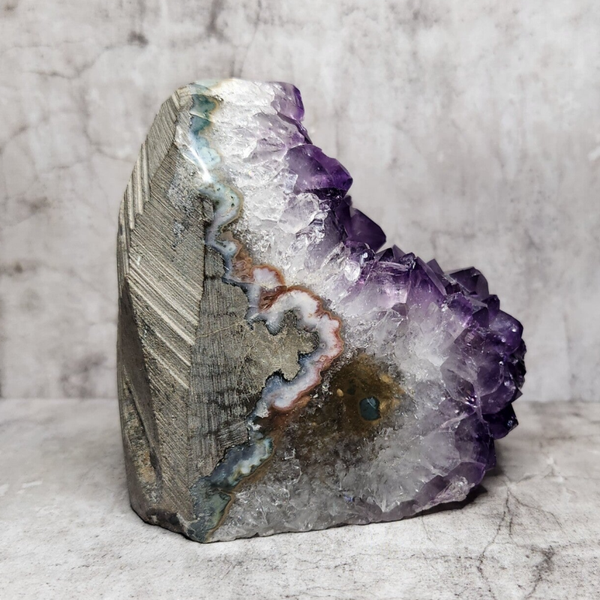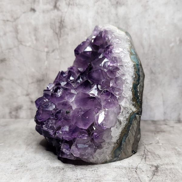 Structuur en kleur: Holle gesteentemassa’s bekleed met sprankelende, prismatische amethistpunten in tinten van lila tot diep violet. Vaak met een buitenzijde van grijze kalksteen of agaatstructuren.