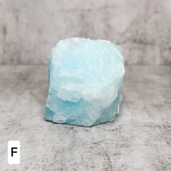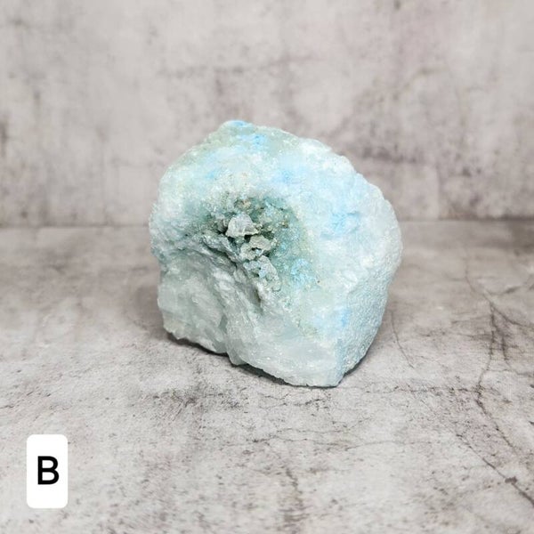 Structuur en kleur: Licht hemelsblauw tot turquoise, met zachte golvende structuren of afgeronde knobbels. De kleur heeft vaak een doorschijnende, bijna waterachtige kwaliteit.