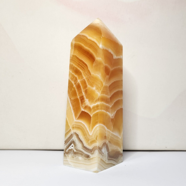 Honing Calciet toren straalt een zachte gloed uit, als vloeibare zon gevangen in steen. De warme tinten variëren van goudgeel tot crème, met sierlijke banden die zich als golven door het oppervlak weven. Bij doorvallend licht ontvouwt zich een bijna etherische schittering, alsof de steen van binnenuit verlicht wordt.