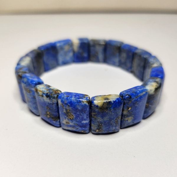 Lapis Lazuli is een gesteente dat hoofdzakelijk bestaat uit lazuriet en vaak verweven is met calciet en pyriet. Het kleurenpalet varieert van nachtblauw tot diep koningsblauw, vaak onderbroken door gouden stippen of witte aders.