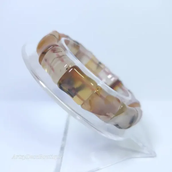 Carneool Agaat behoort tot de chalcedoonfamilie en toont tinten van oranje, rood, bruin en geel, vaak met doorschijnende lagen en banden. De kleur kan zacht en honingachtig zijn of dieper en vuriger.